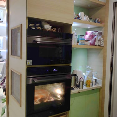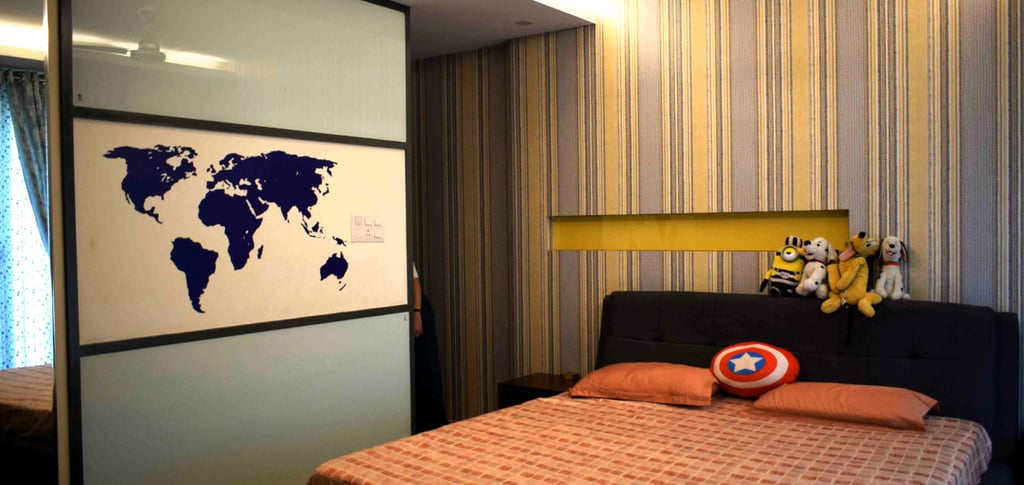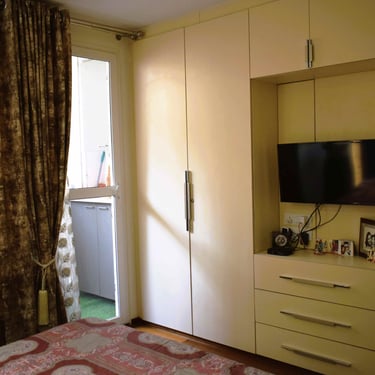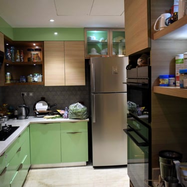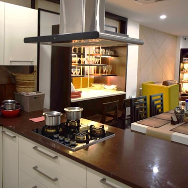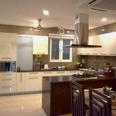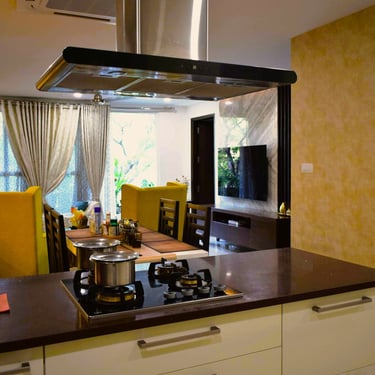 Strategic civil modifications opened up the kitchen and dining area, creating a wide, airy, and seamless flow between spaces. Ample hidden storage solutions, including sleek concealed wardrobes, enhance functionality while maintaining a clutter-free aesthetic.