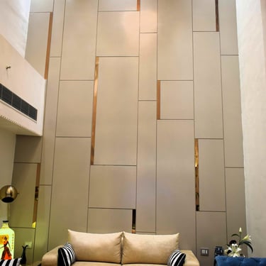 The double-height living room creates a grand and airy atmosphere, enhancing the spatial experience with abundant natural light. Custom-made wall paneling adds a layer of sophistication, seamlessly blending aesthetics with functionality.