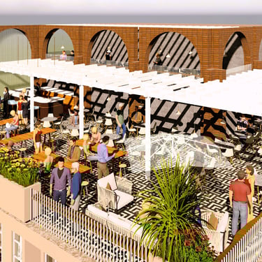 The terrace blends local architecture with modern functionality, highlighted by free-standing arches that add a vernacular touch.