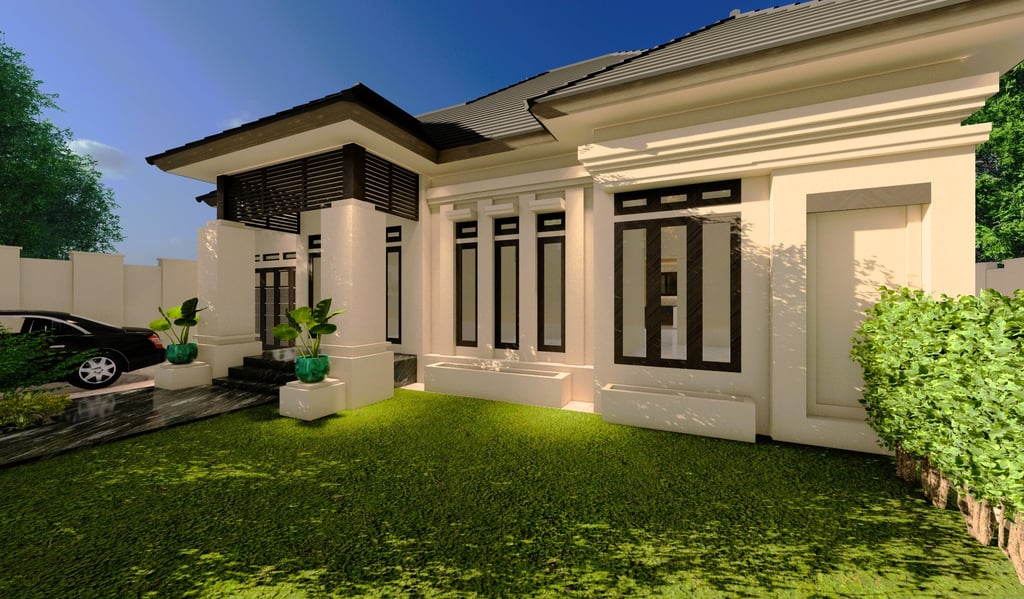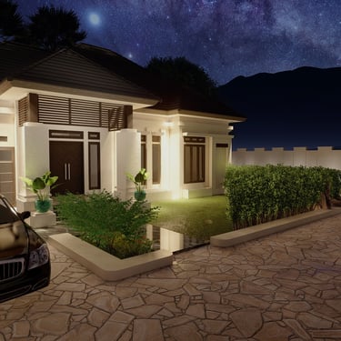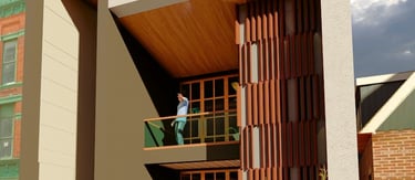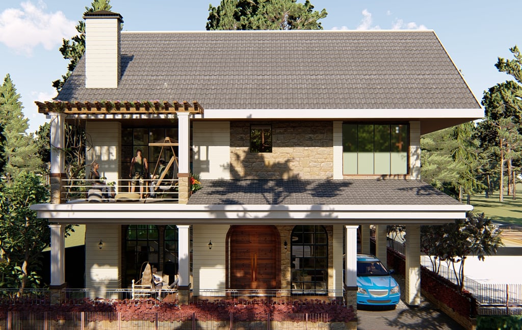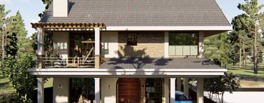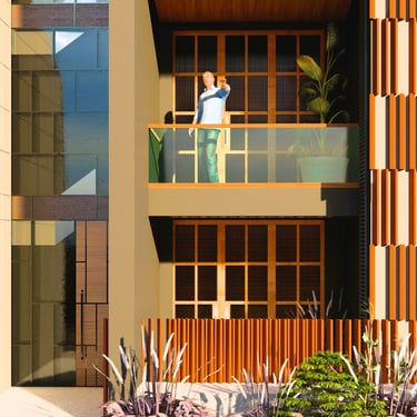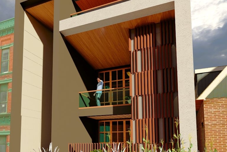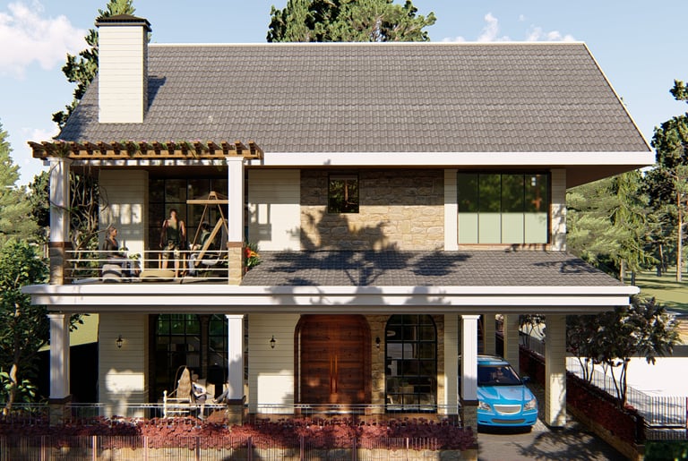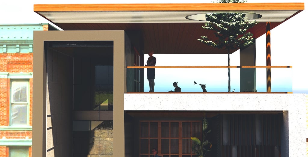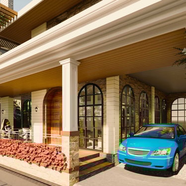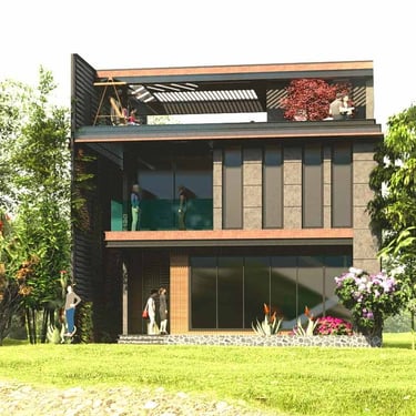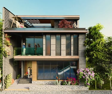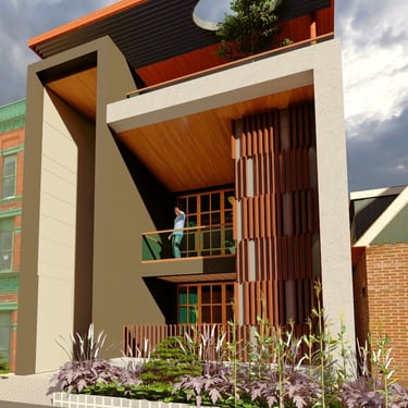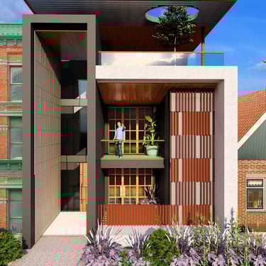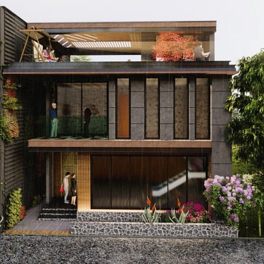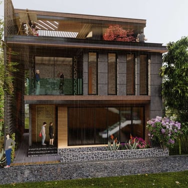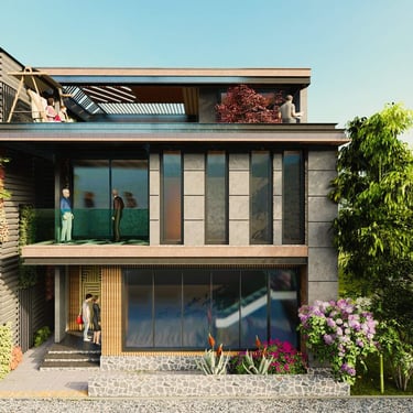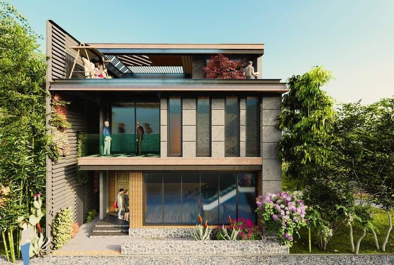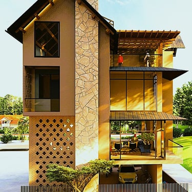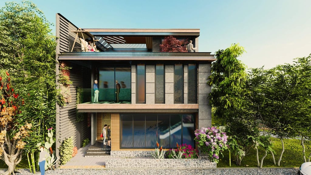 The elevation is thoughtfully enhanced to achieve a bold yet elegant presence, where raw textures and natural materials create a warm, contemporary aesthetic.
