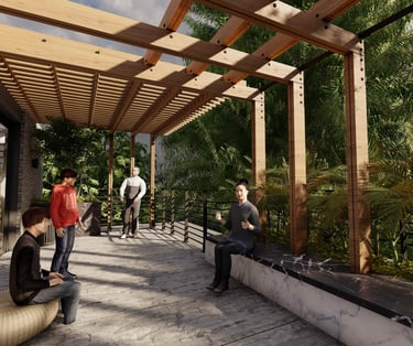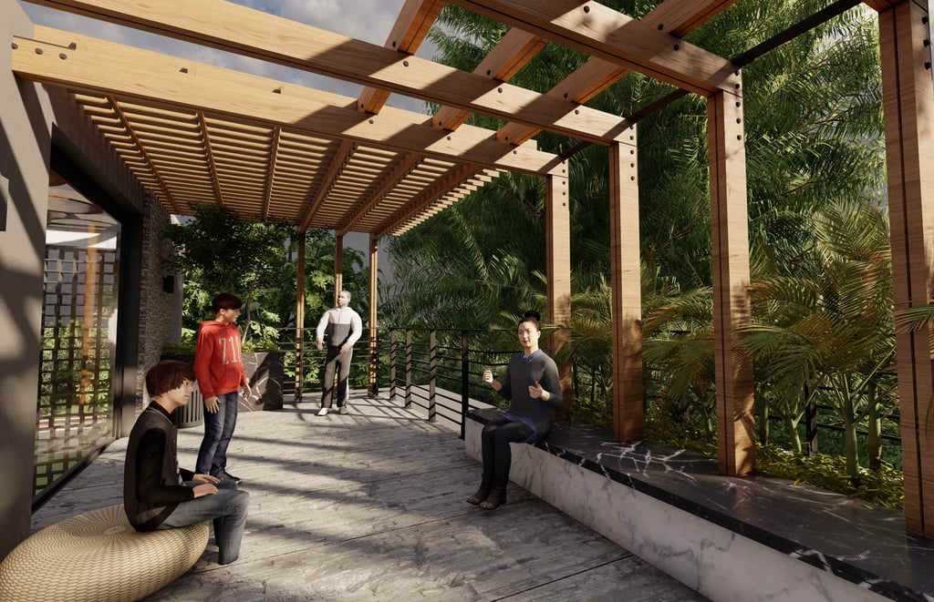 The terrace has been transformed into a private family retreat, featuring a wide-open party area with a large outdoor pergola seating at the front, perfect for gatherings.