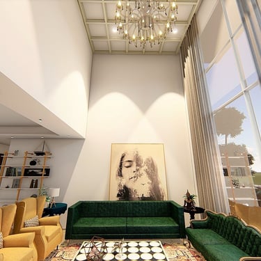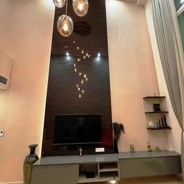 The double-height living room creates a grand and airy atmosphere, enhancing the spatial experience with abundant natural light. Custom-made wall paneling adds a layer of sophistication, seamlessly blending aesthetics with functionality.