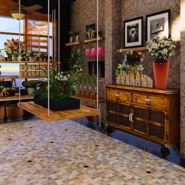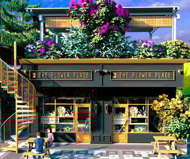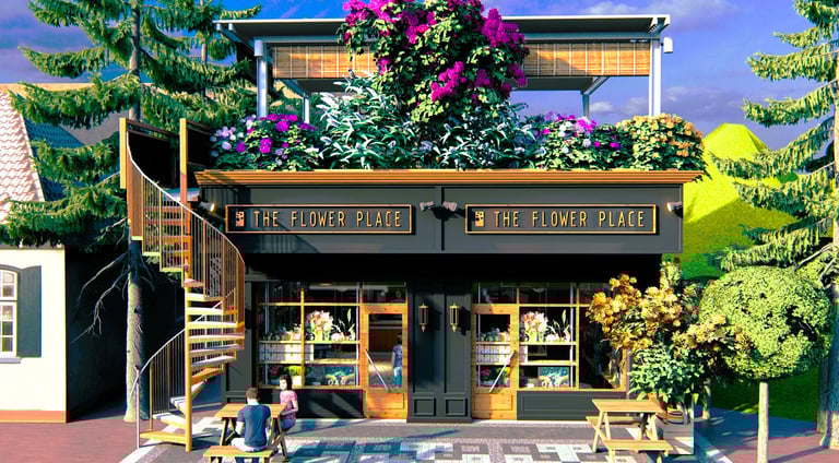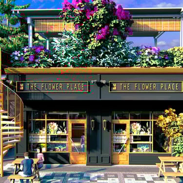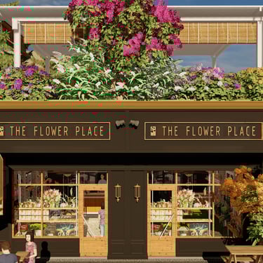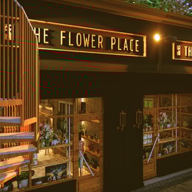 Inside, the interiors exude a botanical aesthetic, with earthy tones, wooden shelving, and soft lighting, creating a refreshing ambiance for both flower shopping and casual meetups. The rooftop café, shaded by a pergola with open-air seating, offers an intimate retreat with a view, perfect for enjoying coffee amidst blooming greens.