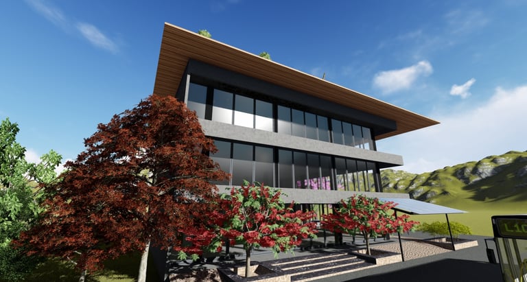 Designed for both function and aesthetics, the hotel features glass façades, wooden accents, and stone finishes, creating a warm yet modern ambiance.